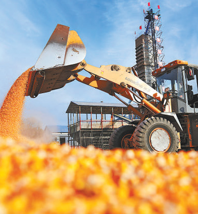 黑龍江北大荒農墾集團趙光農場,鏟車在曬場傾倒玉米。