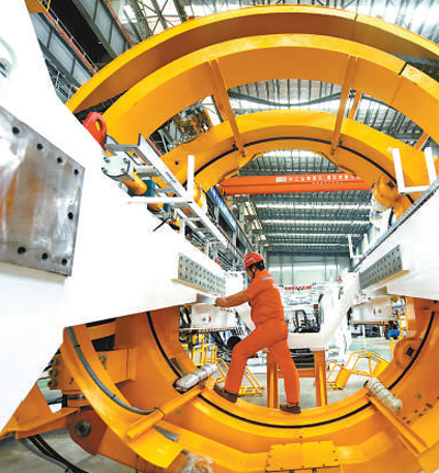 浙江中鐵裝備盾構機生產基地,工人在安裝新型盾構機的部件。