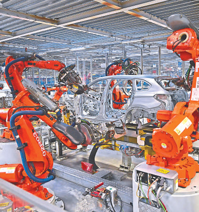 華晨寶馬沈陽鐵西工廠車身車間,機械臂在焊接車身。