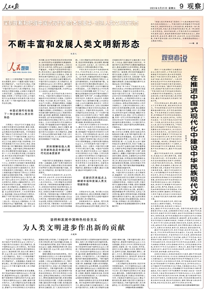 “創造人類文明新形態”是黨的二十大報告概括的中國式現代化的本質要求之一。中國式現代化深深植根于中華優秀傳統文化,體現科學社會主義的先進本質,借鑒吸收一切人類優秀文明成果,代表人類文明進步的發展方向,是一種全新的人類文明形態。新時代新征程,以中國式現代化全面推進中華民族偉大復興,要始終堅持和發展中國特色社會主義,推動物質文明、政治文明、精神文明、社會文明、生態文明協調發展,不斷豐富和發展人類文明新形態。本期觀察版圍繞這一主題進行闡述。